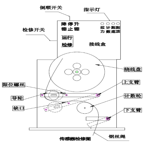 **后檢查一下導輪、計數(shù)輪轉(zhuǎn)動是否靈活,上支臂水平時,缺口要和限位螺絲剛好吻合。檢修完畢,將“倒順開關(guān)”撥到“升錘”,繞線盤順時針旋轉(zhuǎn),直到重錘上升到頂部,電機會自動斷電,此時將“倒順開關(guān)”撥回中間“!保賹ⅰ皺z修開關(guān)”撥到“運行”,蓋上外殼。